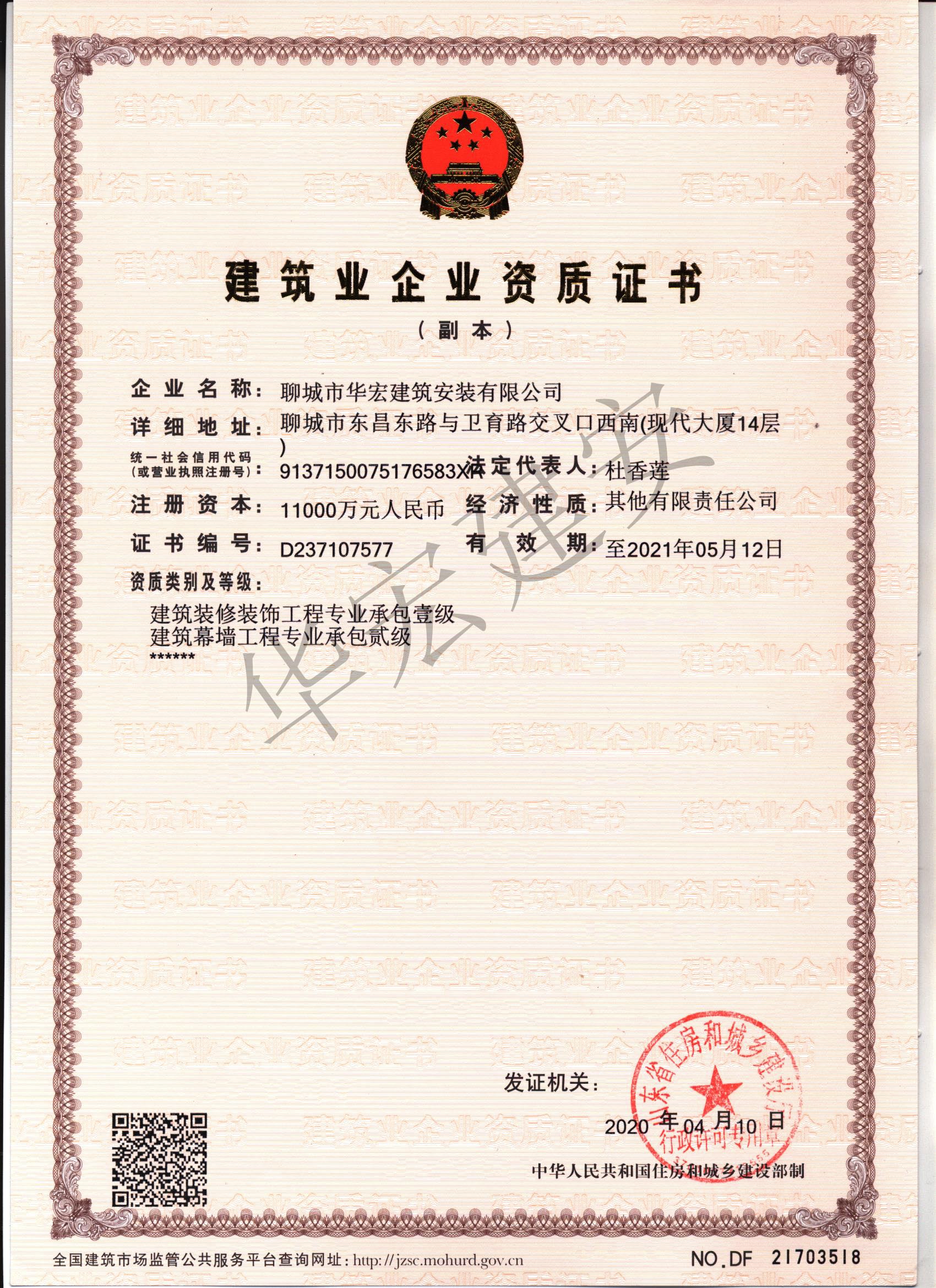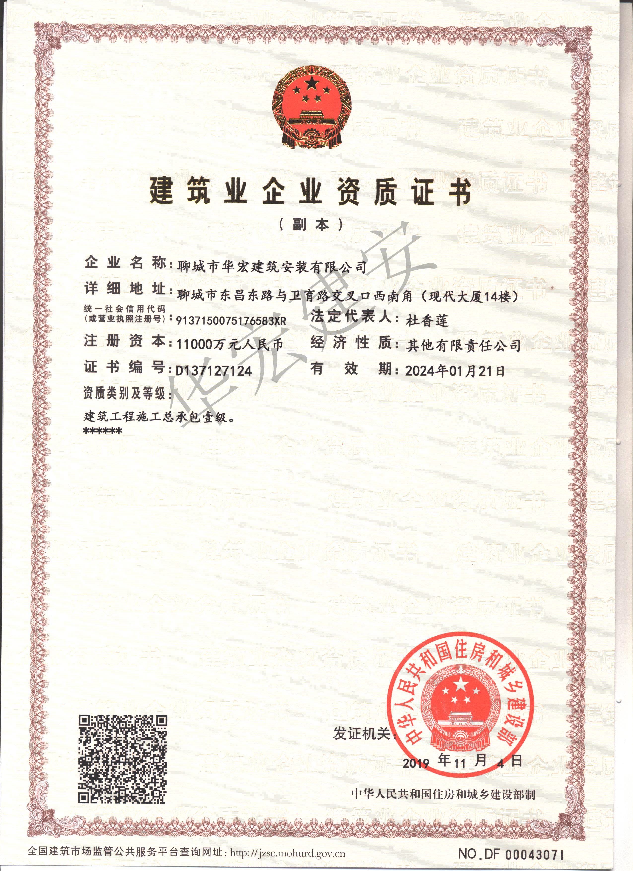 聊城市華宏建筑安裝有限公司成立于2002年5月,公司自2002年成立以來,不斷發(fā)揚 “敬業(yè)修身 打造精品 開拓創(chuàng)新 弄潮勇進”的創(chuàng)業(yè)精神,始終遵循“以質量求生存、靠精品創(chuàng)品牌、憑信譽贏市場”的宗旨,認真奉行“科學 高效 一流”的質量方針
